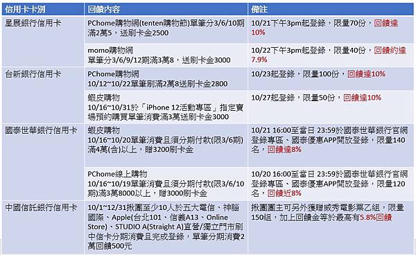 此外,同樣推出回饋達10%的台新銀行信用卡,則是分別在PChome購物網推出單筆刷滿2萬8送刷卡金2800元(10/12~10/22),以及在蝦皮購物的「iPhone 12活動專區」指定賣場推出,預約購買單筆消費滿3萬送刷卡金3000元的優惠(10/16~10/31)。